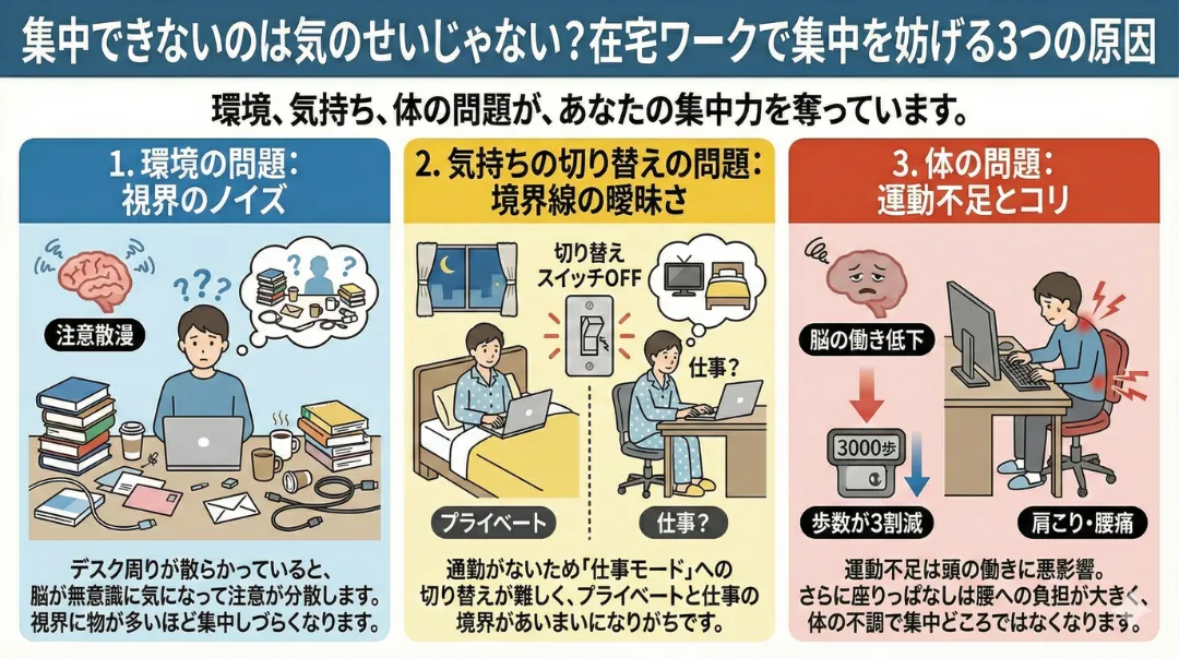 集中できないのは、実は意志の弱さではありません。環境や習慣の構造に問題があることが、色々な研究で証明されています。この記事では、在宅ワークで集中できない本当の原因と、今日からすぐ試せる改善策をご紹介します。