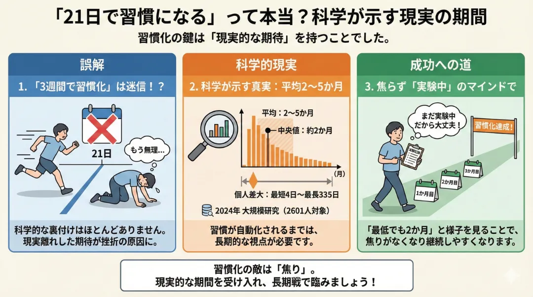 実はこれ、科学的な裏付けがほとんどないんです。2024年に発表された大規模な研究(2601名を対象)で分かったのは、習慣が自動的にできるようになるまで、平均で2~5か月かかるという事実でした。中央値でも約2か月。人によっては4日で習慣になる人もいれば、335日かかる人もいるそうです。